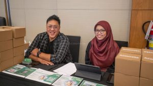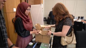 Pada seminar akustik ini juga disediakan booth dari beberapa perusahaan penyedia material. Salah satunya adalah Acourete yang menyediakan sampel material peredam suara untuk dibagikan pada peserta seminar. Tim Acourete yang bertugas adalah Harry dan Retno.